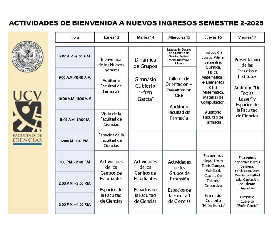 La Coordinación de Extensión de la Facultad de Ciencias de la Universidad Central de Venezuela anuncia el calendario de actividades académicas, culturales y deportivas que serán desarrolladas por las autoridades, centros de estudiantes y grupos de extensión, con motivo de la bienvenida a los nuevos ingresos para el semestre 2-2025.