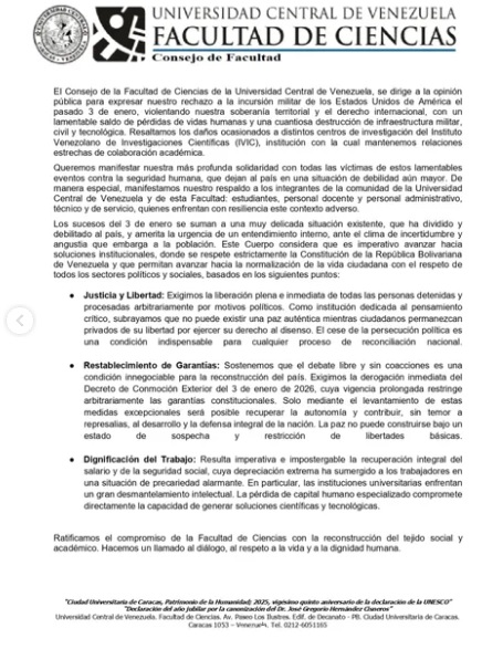 Comunicado de la Facultad de Ciencias de la Universidad Central de Venezuela