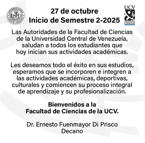 Las Autoridades de la Facultad de Ciencias de la Universidad Central de Venezuela, saludan a todos los estudiantes que este 27 de octubre inician sus actividades académicas. Navegación de entradas Calendario Académico del Semestre 02-2025