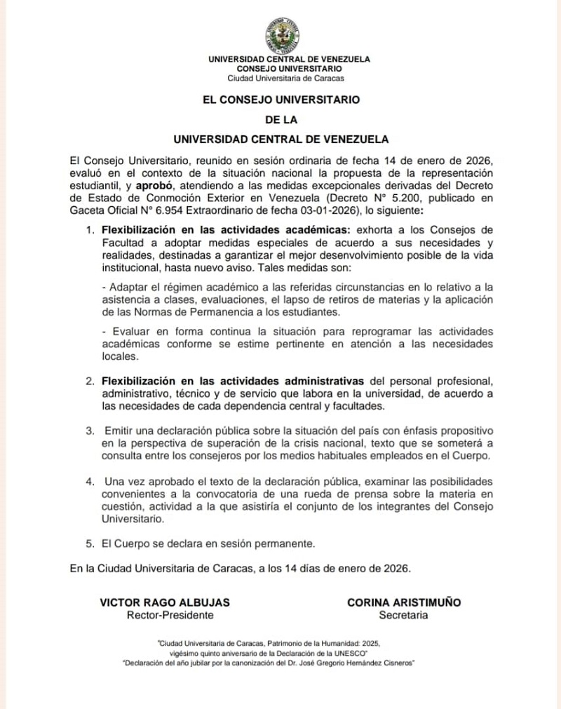 Comunicado del Consejo Universitario de la Universidad Central de Venezuela