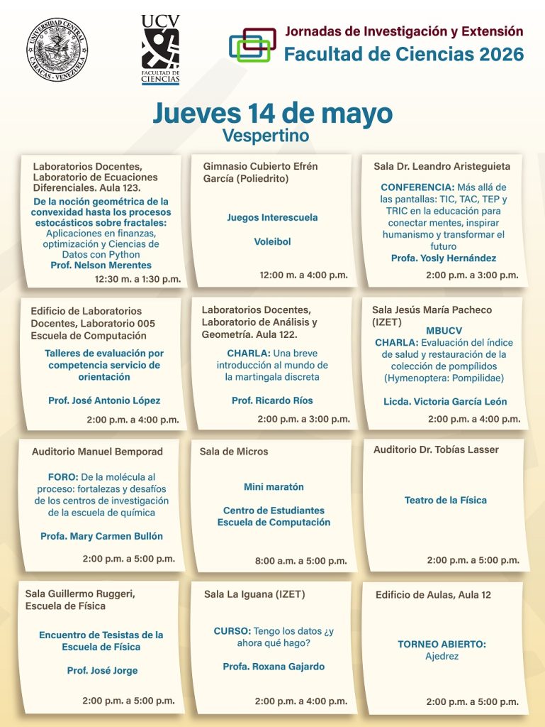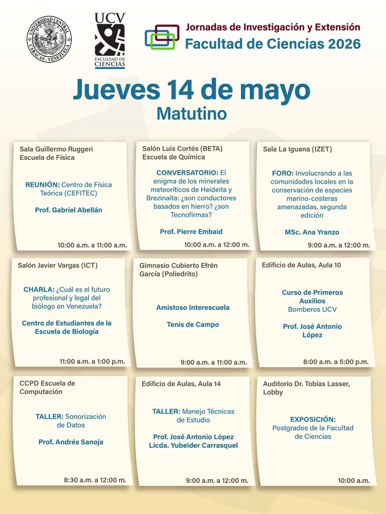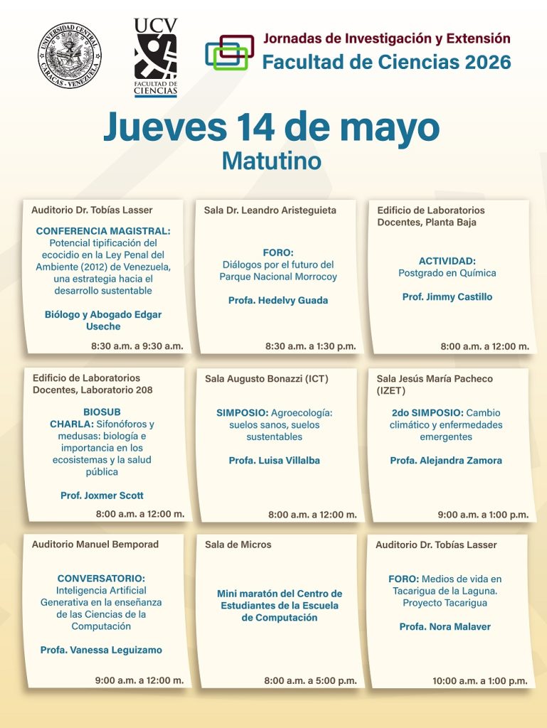 Del 11 al 15 de mayo se desarrollarán las Jornadas de Investigación y Extensión Facultad de Ciencias 2026 (JIE 2026) y en la que tendrán lugar en nuestras instalaciones, diversas actividades científicas y culturales inherentes a la extensión universitaria en las cuales se presentará el quehacer científico. Entre las actividades a desarrollarse durante las JIE 2026 están conferencias magistrales en modalidad presencial y en línea, foros y talleres coordinados por profesores e investigadores de las diversas escuelas que conforman la Facultad de Ciencias: Biología, Computación, Física, Matemática y Química, así como de los distintos institutos adscritos a la Facultad: Instituto de Ciencias de la Tierra (ICT), Instituto de Ciencia y Tecnología de Alimentos (ICTA), Instituto de Biología Experimental (IBE) e Instituto de Zoología y Ecología Tropical (IZET). Por otra parte, se realizarán conferencias y actividades culturales y deportivas que abarcarán diversos espacios de la Facultad de Ciencias, así como una salida de campo y excursiones, con la finalidad de fomentar la conservación de la naturaleza y el esparcimiento. Los invitamos a ser parte de las JIE 2026 para intercambiar los avances en las investigaciones que se realizan en las diferentes dependencias de la Facultad de Ciencias y conocer los programas de estudios de pregrado y de postgrado, así como conocer y participar en todas las actividades de extensión programadas durante las jornadas. A continuación, el cronograma completo de actividades para el jueves 14 de mayo. Jornada matutina Jornada vespertina Navegación de entradas Cronograma de actividades del miércoles 13 de mayo en las Jornadas de Investigación y Extensión Facultad de Ciencias 2026