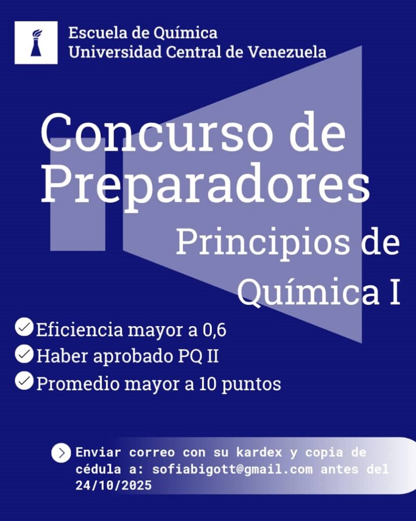 La Escuela de Química de la Facultad de Ciencias de la Universidad Central de Venezuela, anuncia la apertura de un concurso de preparadores. Las asignaturas a dictar son: Laboratorio de Principios de QuímicaPrincipios de Química IPrincipios de Química II Navegación de entradas Dr. Carmelo Bolívar: Entre la investigación por la catálisis y dedicación por la docencia Directores de las Escuelas de la Facultad de Ciencias presentaron charlas de inducción a los nuevos ingresos del semestre 2-2025
