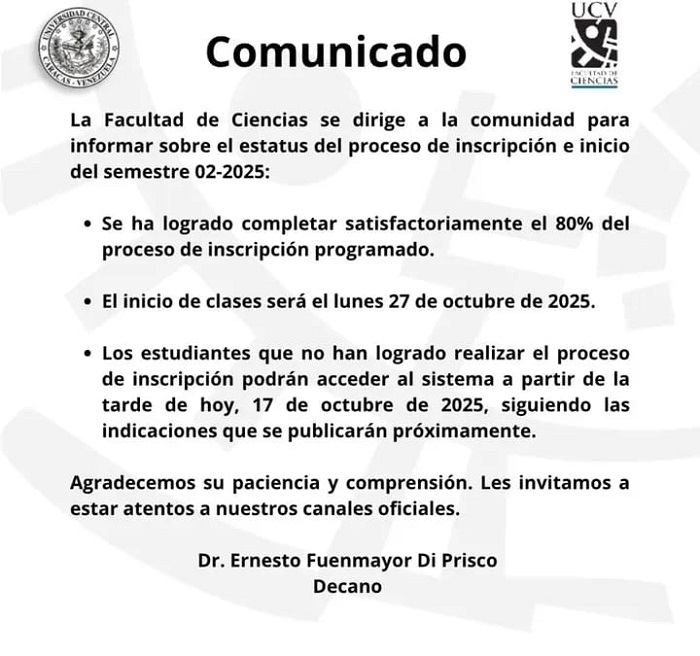 La Facultad de Ciencias se dirige a la comunidad para informar sobre el estatus del proceso de inscripción e inicio del semestre 02-2025. Se ha logrado completar satisfactoriamente el 80% del proceso de inscripción programado. El inicio de clases será el lunes 27 de octubre de 2025. Los estudiantes que no han logrado realizar el proceso de inscripción podrán acceder al sistema a partir de la tarde de hoy, 17 de octubre de 2025, siguiendo las indicaciones que se publicarán próximamente. Agradecemos su paciencia y comprensión. Les invitamos a estar atentos a nuestros canales oficiales. Dr. Ernesto Fuenmayor Di Prisco Decano Navegación de entradas Directores de las Escuelas de la Facultad de Ciencias presentaron charlas de inducción a los nuevos ingresos del semestre 2-2025 Acceso alternativo y provisional al sistema de gestión académica CONEST